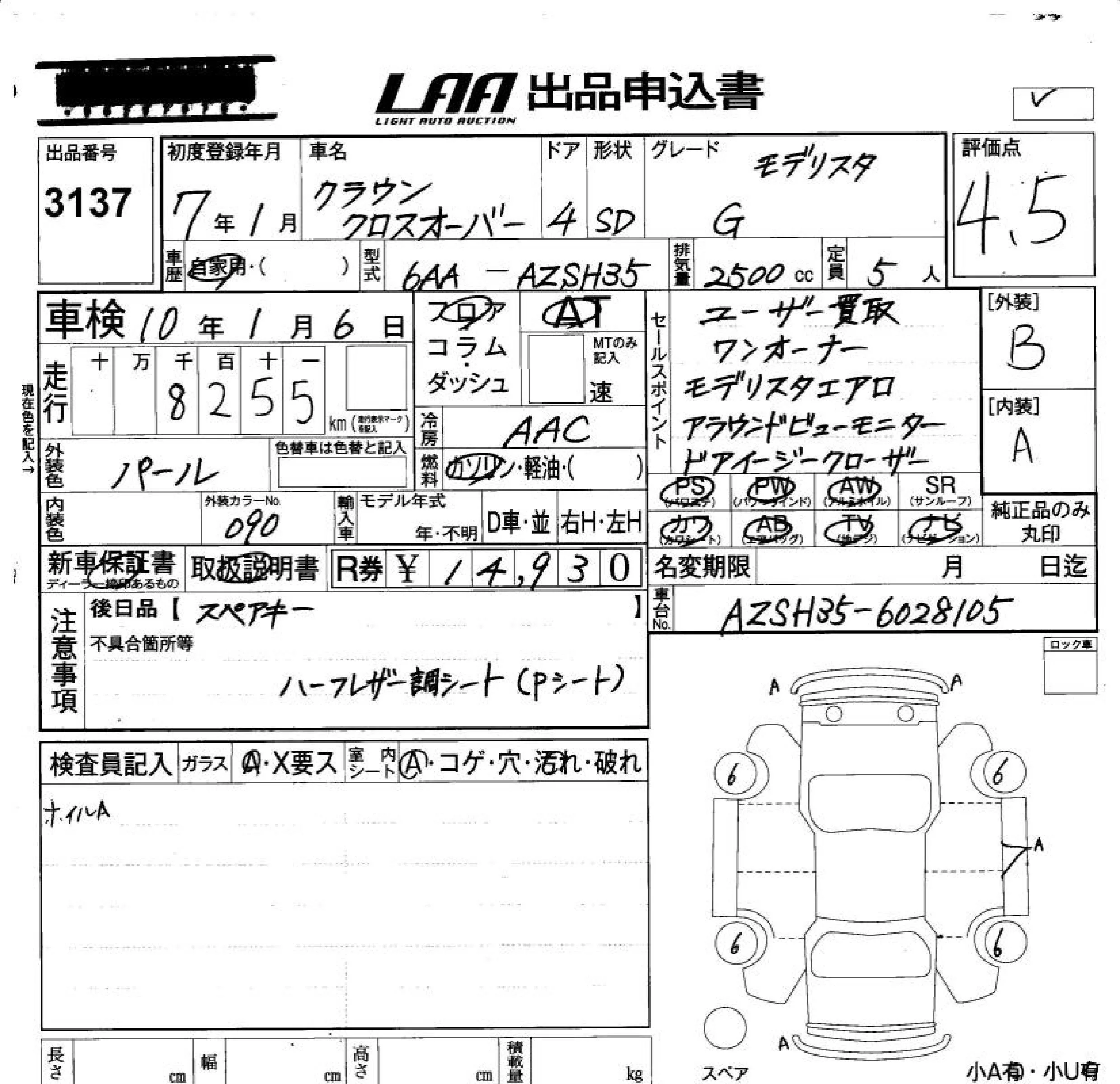 Toyota CROWN CROSSOVER с аукциона Японии LAA Okayama лот № 3137