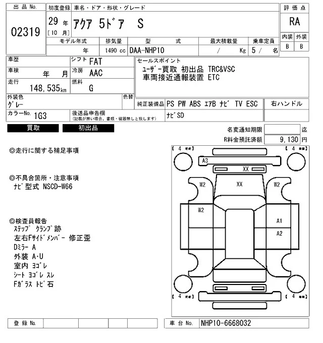 Toyota AQUA с аукциона Японии ARAI Bayside лот № 2319