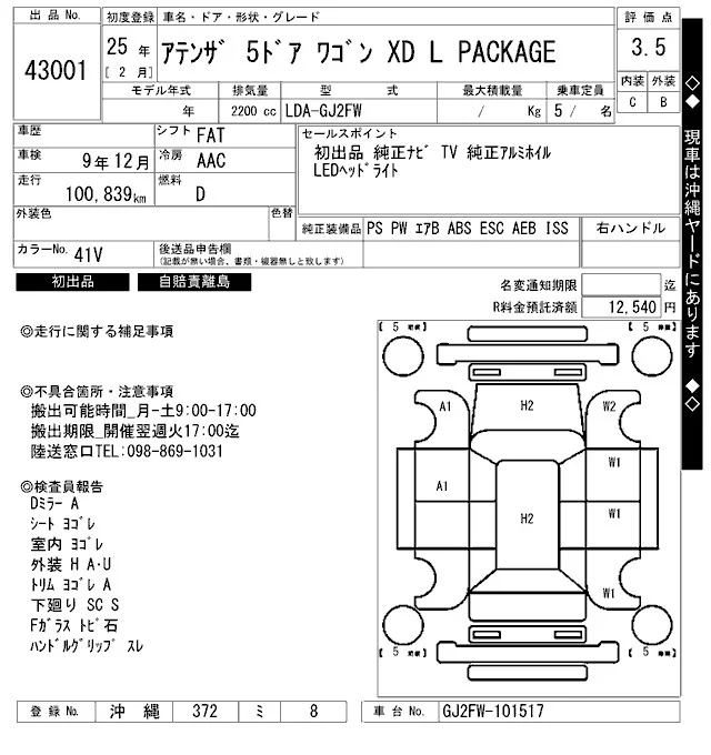 Mazda ATENZA WAGON с аукциона Японии ARAI Bayside лот № 43001