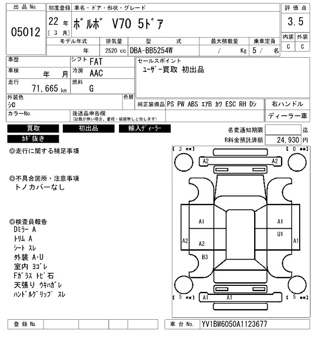 Volvo V70 с аукциона Японии ARAI Bayside лот № 5012