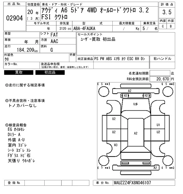Audi A6 с аукциона Японии ARAI Bayside лот № 2904