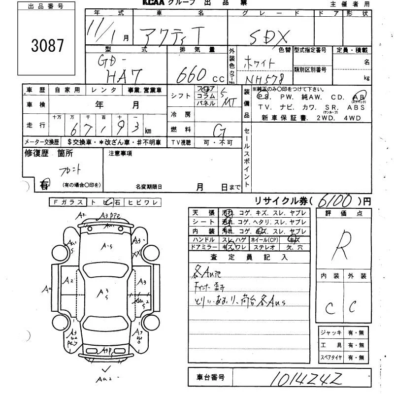 Honda ACTY TRUCK с аукциона Японии KCAA Yamaguchi лот № 3087