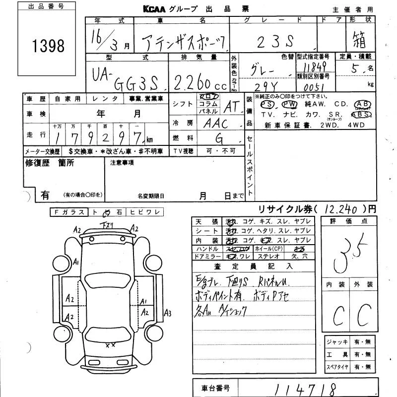 Mazda ATENZA SPORT с аукциона Японии KCAA Yamaguchi лот № 1398