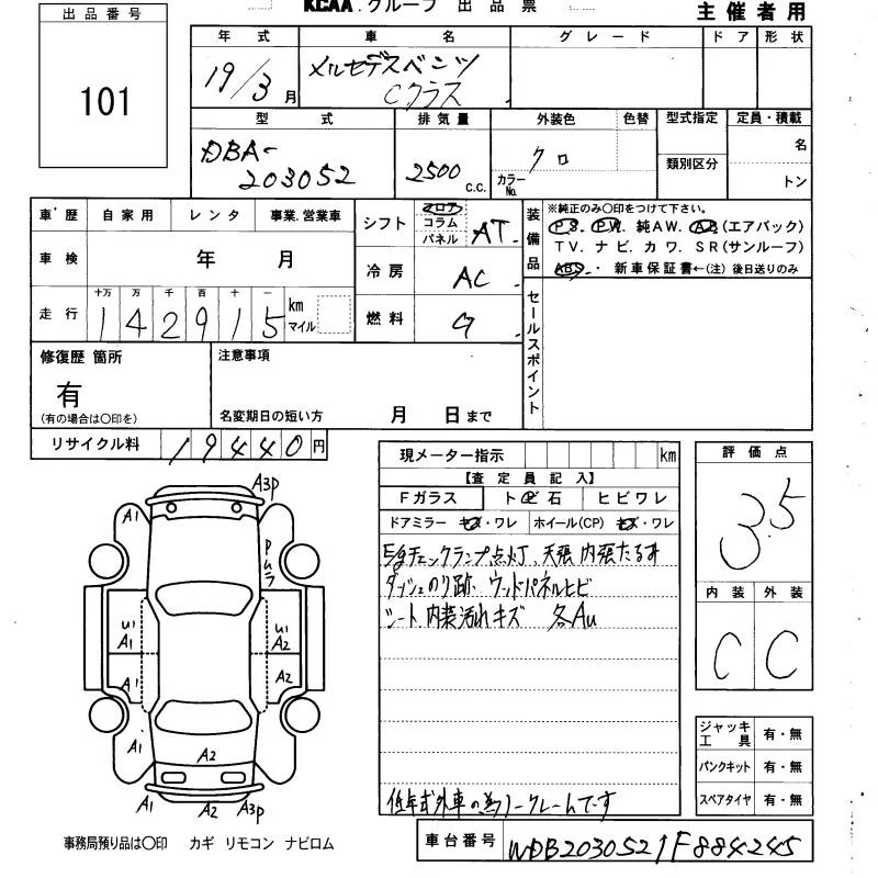 Mercedes-Benz C CLASS с аукциона Японии KCAA Yamaguchi лот № 101