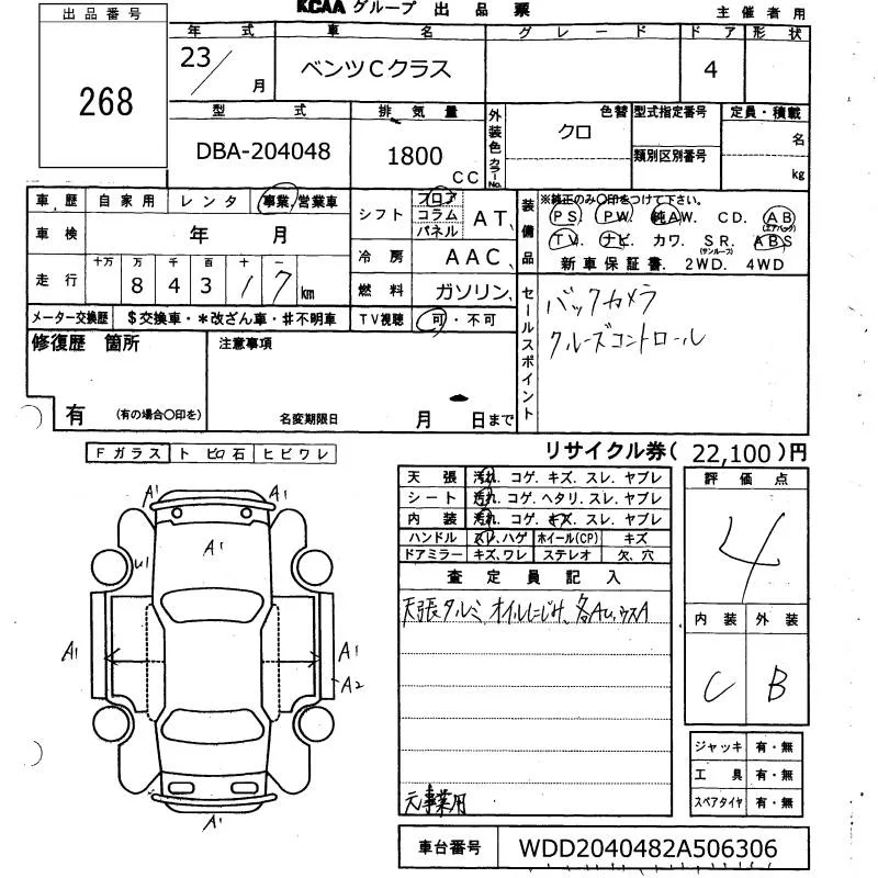 Mercedes-Benz C CLASS с аукциона Японии KCAA Yamaguchi лот № 268