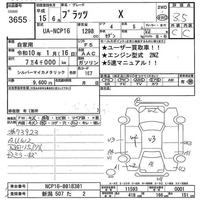 Toyota PLATZ с аукциона Японии JU Niigata лот № 3655