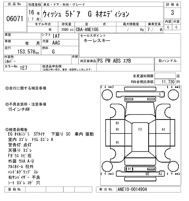 Toyota WISH с аукциона Японии ARAI Sendai лот № 6071