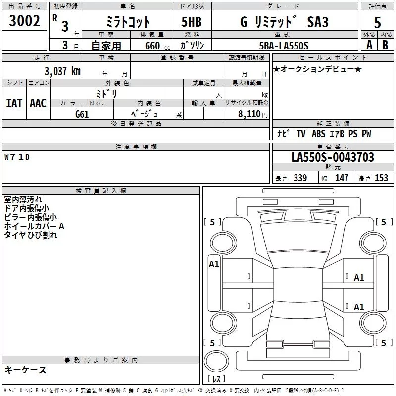 Daihatsu MIRA TOCOT с аукциона Японии TAA Yokohama лот № 3002