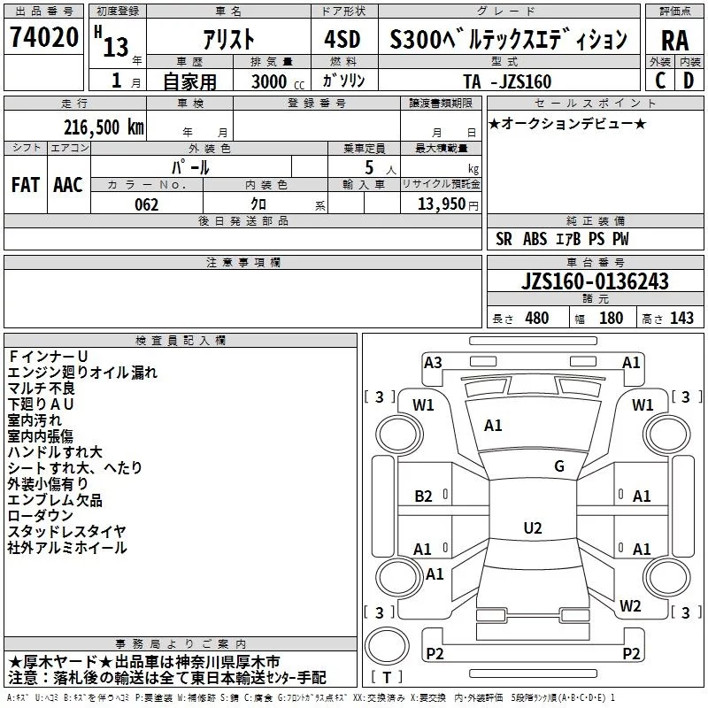 Toyota ARISTO с аукциона Японии TAA Yokohama лот № 74020
