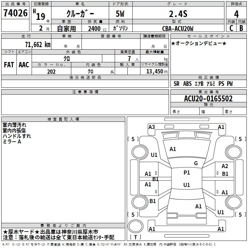 Toyota KLUGER с аукциона Японии TAA Yokohama лот № 74026
