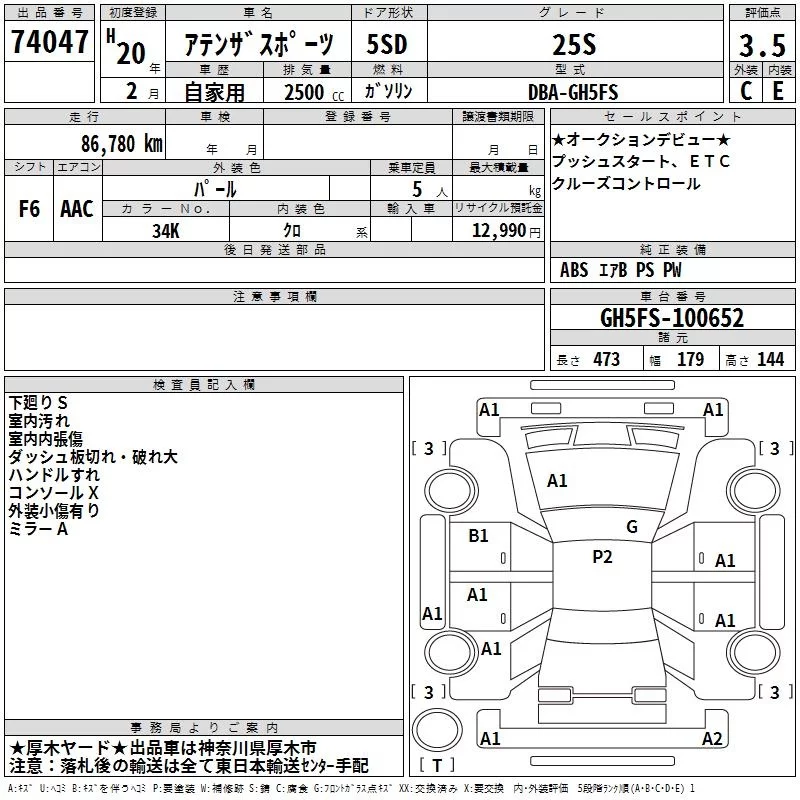Mazda ATENZA SPORT с аукциона Японии TAA Yokohama лот № 74047