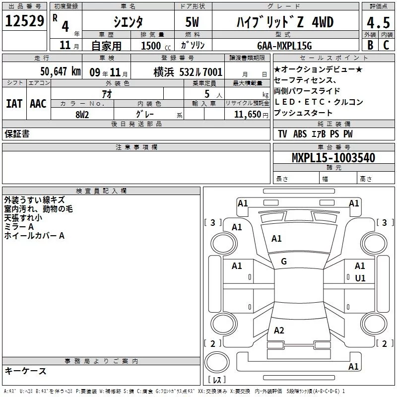 Toyota SIENTA с аукциона Японии TAA Yokohama лот № 12529