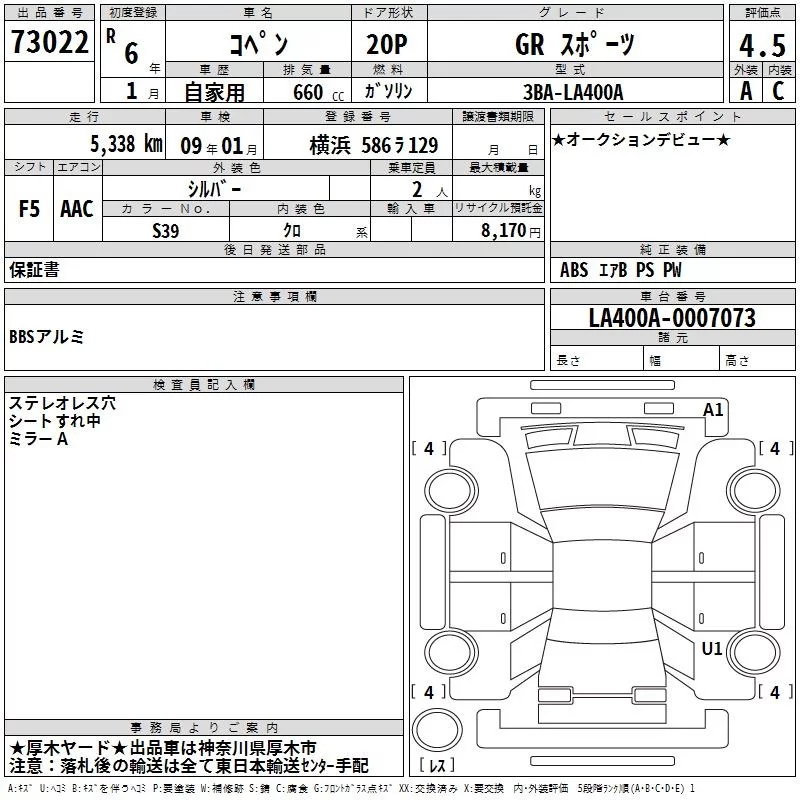 Toyota COPEN с аукциона Японии TAA Yokohama лот № 73022