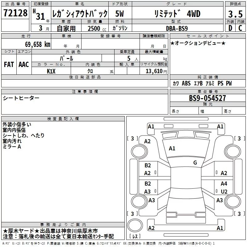 Subaru LEGACY OUTBACK с аукциона Японии TAA Yokohama лот № 72128