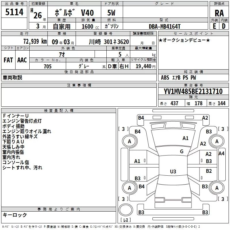 Volvo V40 с аукциона Японии TAA Yokohama лот № 5114