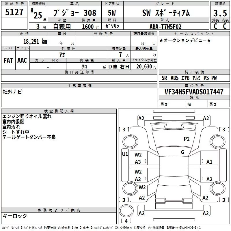 Peugeot 308 с аукциона Японии TAA Yokohama лот № 5127