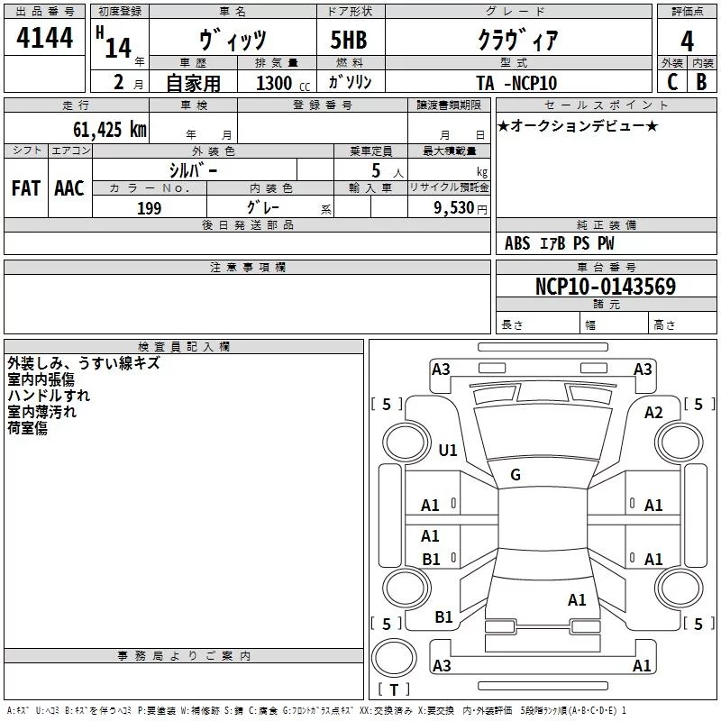 Toyota VITZ с аукциона Японии TAA Hyogo лот № 4144
