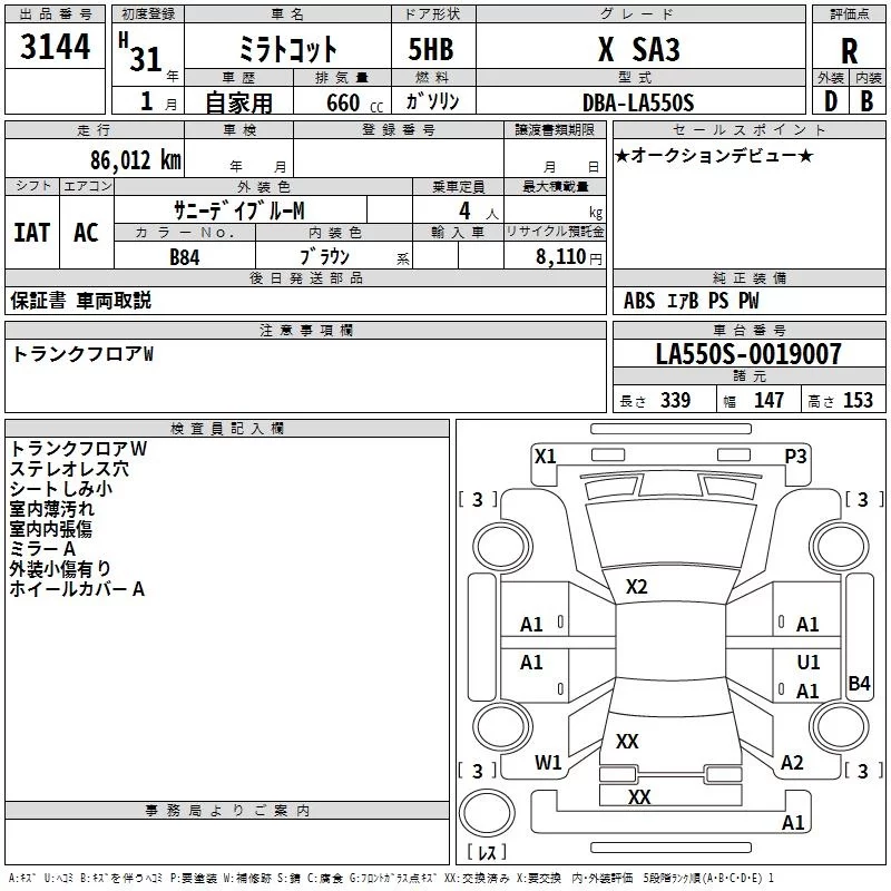 Daihatsu MIRA TOCOT с аукциона Японии TAA Hyogo лот № 3144