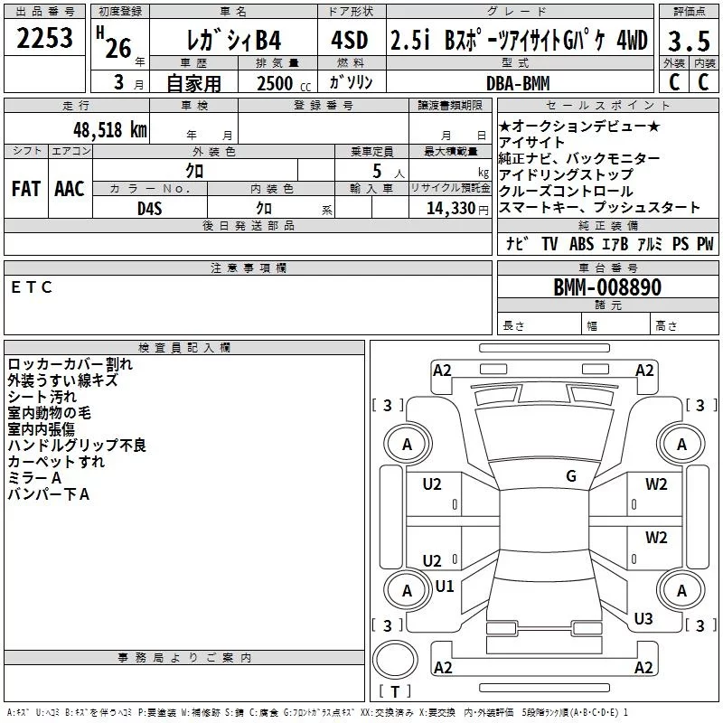 Subaru LEGACY B4 с аукциона Японии TAA Hyogo лот № 2253