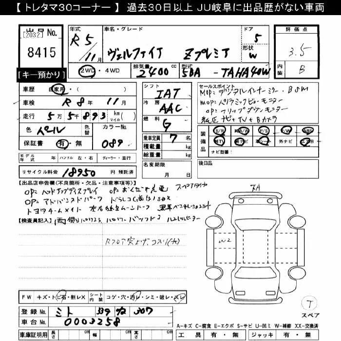 Toyota VELLFIRE с аукциона Японии JU Gifu лот № 8415