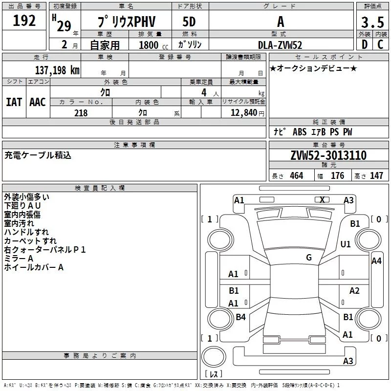 Toyota PRIUS PHV с аукциона Японии TAA Kinki лот № 192