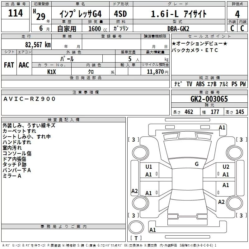 Subaru IMPREZA G4 с аукциона Японии TAA Kinki лот № 114