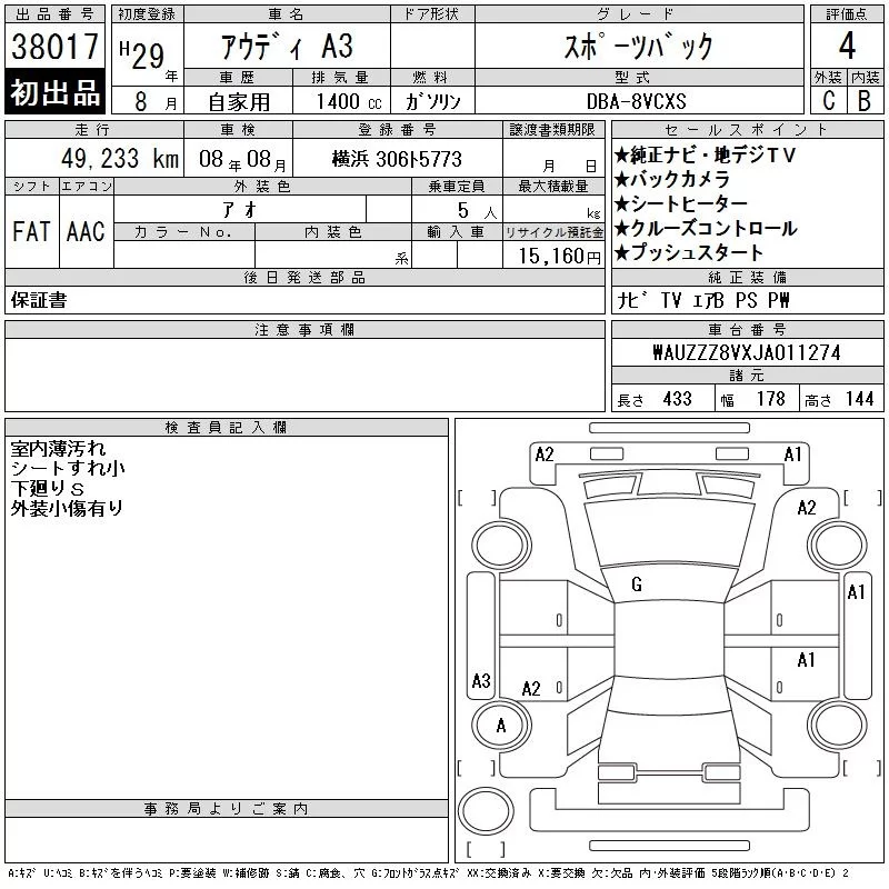 Audi A3 с аукциона Японии CAA Tokyo лот № 38017