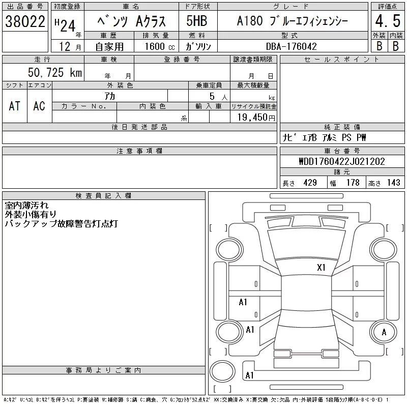 Mercedes-Benz A CLASS с аукциона Японии CAA Tokyo лот № 38022