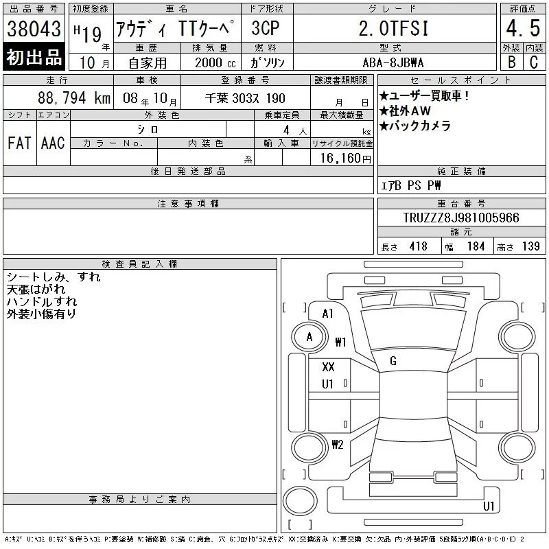 Audi TT с аукциона Японии CAA Tokyo лот № 38043