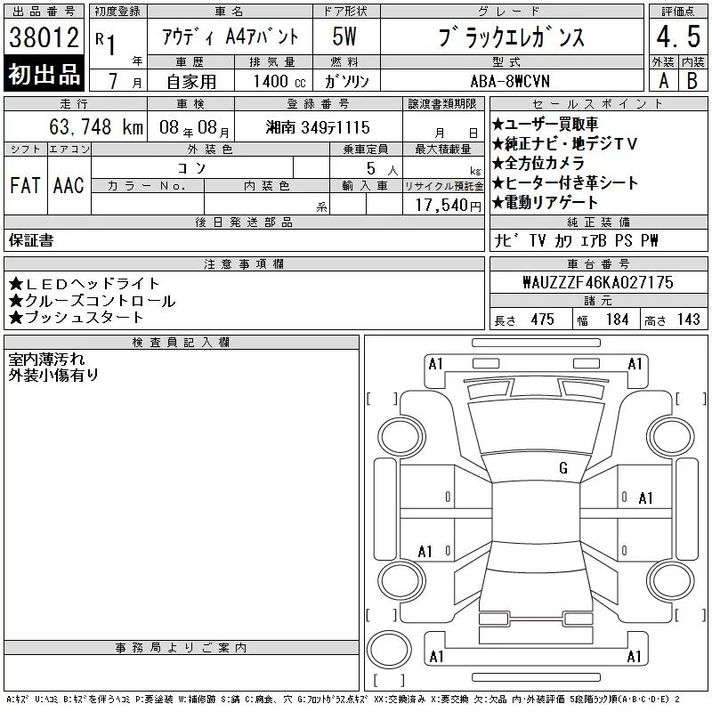 Audi A4 с аукциона Японии CAA Tokyo лот № 38012