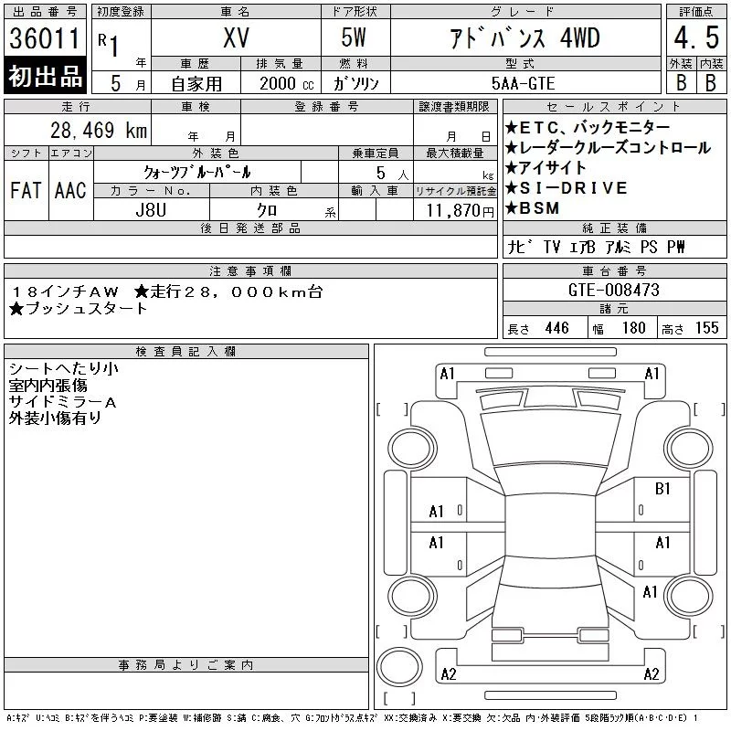 Subaru XV с аукциона Японии CAA Tokyo лот № 36011
