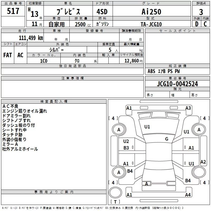 Toyota BREVIS с аукциона Японии TAA Kinki лот № 517