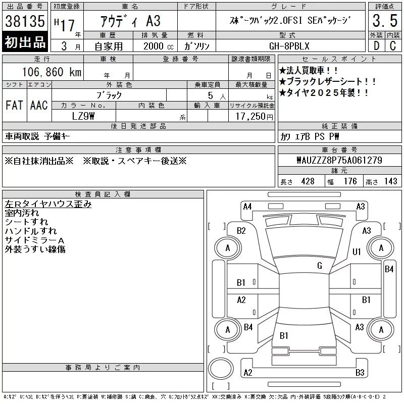 Audi A3 с аукциона Японии CAA Tokyo лот № 38135