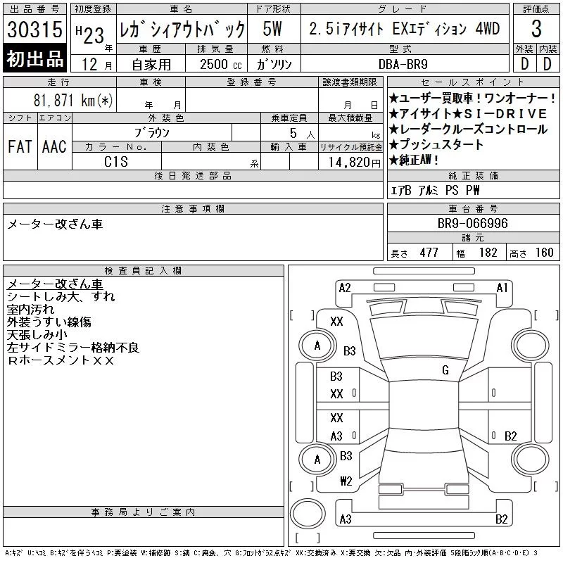 Subaru LEGACY OUTBACK с аукциона Японии CAA Tokyo лот № 30315
