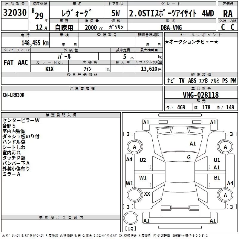 Subaru LEVORG с аукциона Японии TAA Kinki лот № 32030