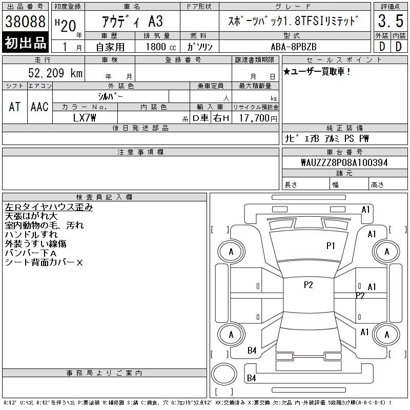 Audi A3 с аукциона Японии CAA Tokyo лот № 38088