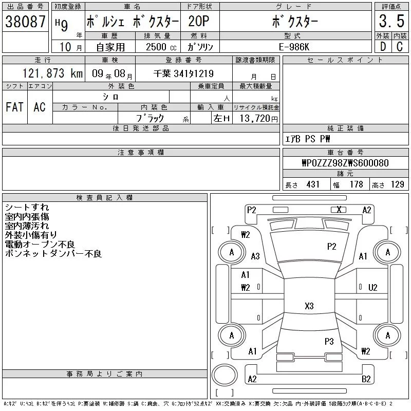 Porsche Boxster с аукциона Японии CAA Tokyo лот № 38087