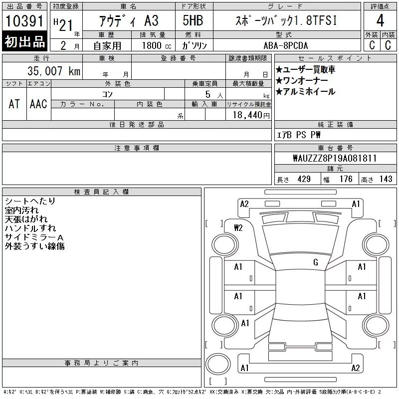 Audi A3 с аукциона Японии CAA Tokyo лот № 10391