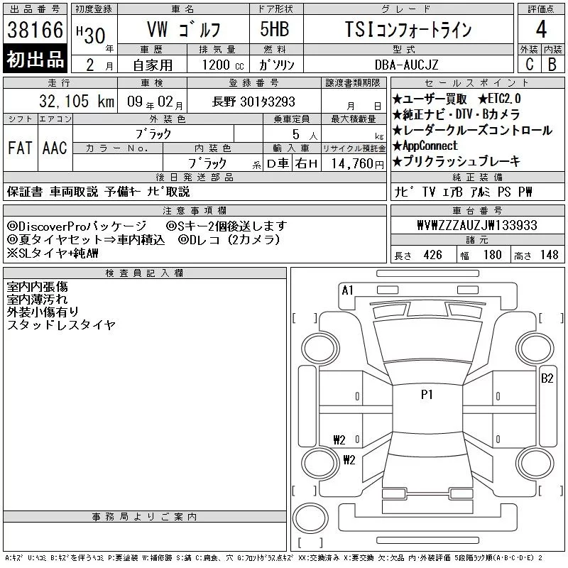Volkswagen GOLF с аукциона Японии CAA Tokyo лот № 38166