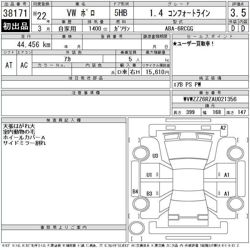 Volkswagen POLO с аукциона Японии CAA Tokyo лот № 38171