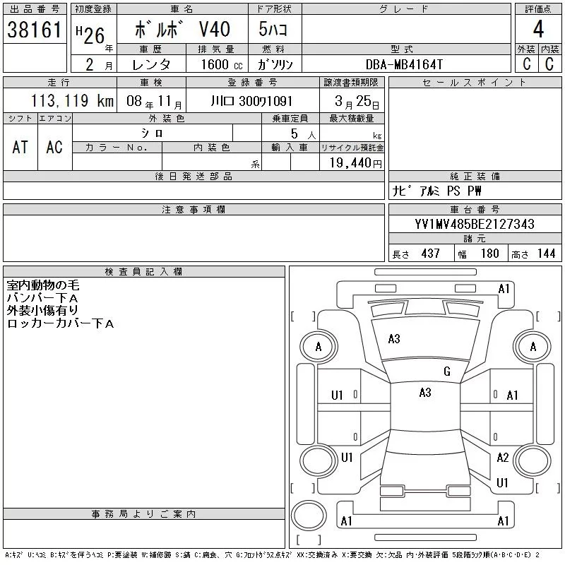 Volvo V40 с аукциона Японии CAA Tokyo лот № 38161