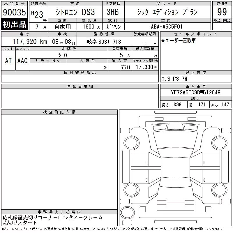 Citroen DS3 с аукциона Японии CAA Gifu лот № 90035