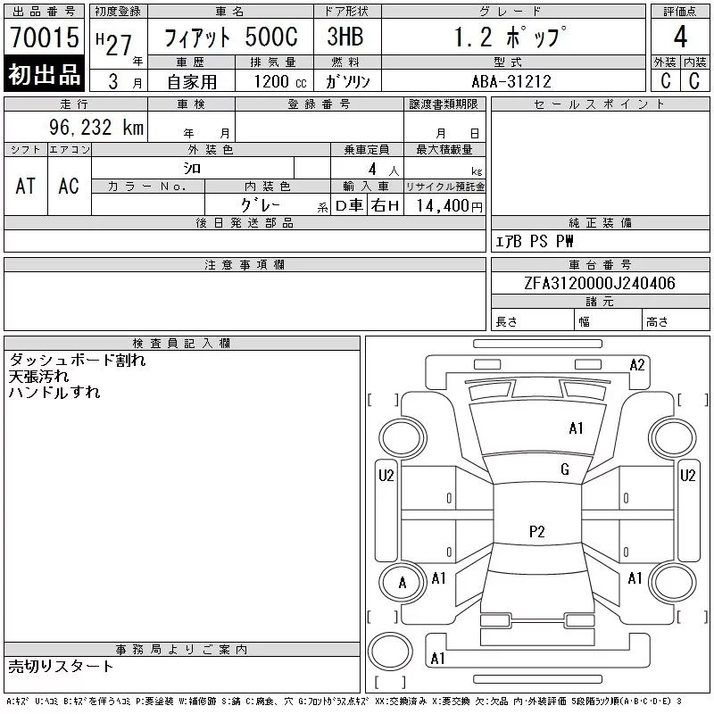 Fiat 500C с аукциона Японии CAA Gifu лот № 70015