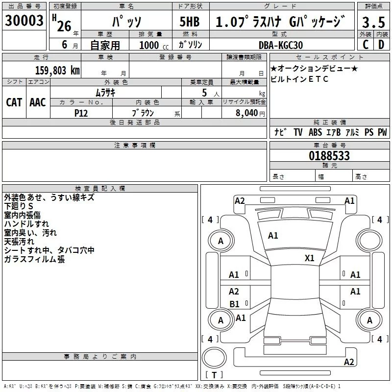 Toyota PASSO с аукциона Японии TAA Hiroshima лот № 30003