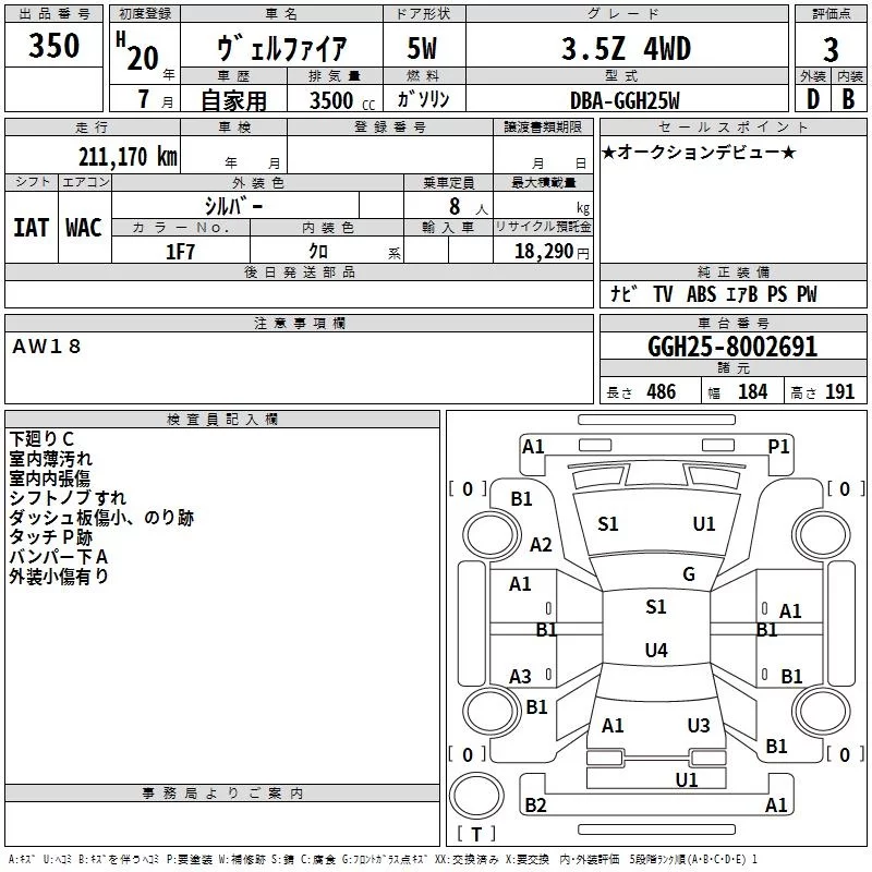 Toyota VELLFIRE с аукциона Японии TAA Hiroshima лот № 350