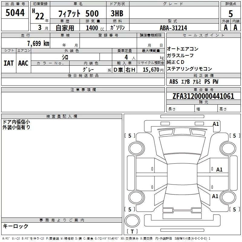 Fiat 500 с аукциона Японии TAA Hiroshima лот № 5044