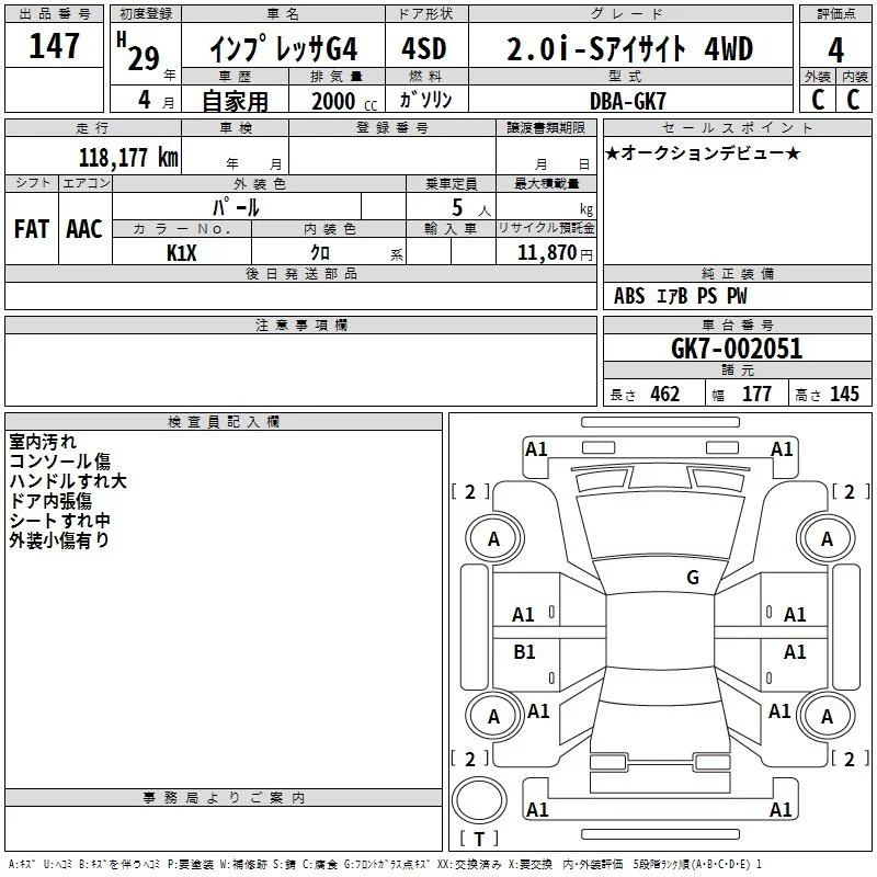 Subaru IMPREZA G4 с аукциона Японии TAA Shikoku лот № 147