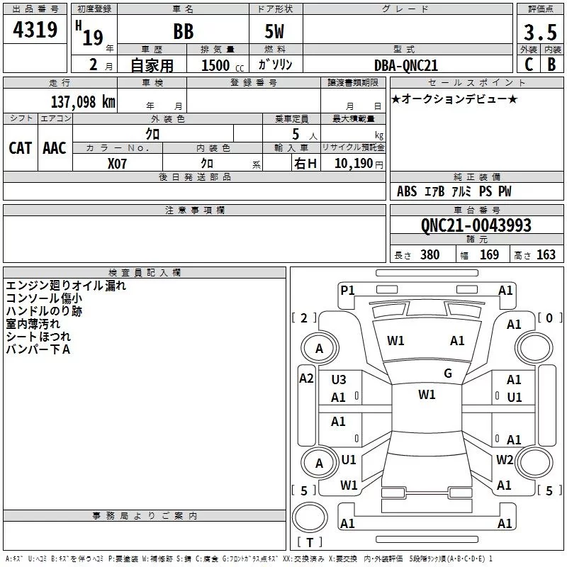 Toyota BB с аукциона Японии TAA Shikoku лот № 4319