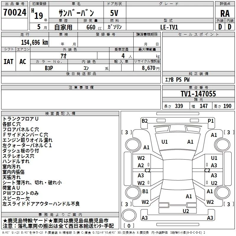 Subaru SAMBAR с аукциона Японии TAA Minami Kyushu лот № 70024