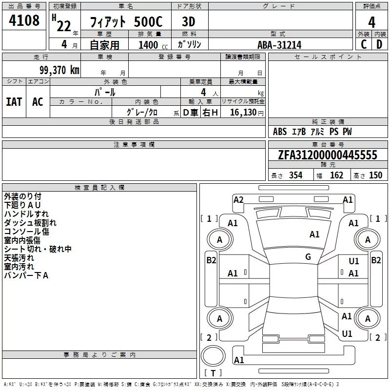 Fiat 500C с аукциона Японии TAA Kyushu лот № 4108